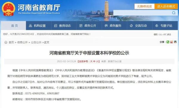 公示信息显示,根据《中华人民共和国高等教育法》《中华人民共和国民办教育促进法》《普通本科学校设置暂行规定》等法律法规和有关政策规定,省教育厅对信阳师范学院申请更名为信阳师范大学、郑州轻工业大学易斯顿美术学院分立为河南郑州美术学院进行了考察。